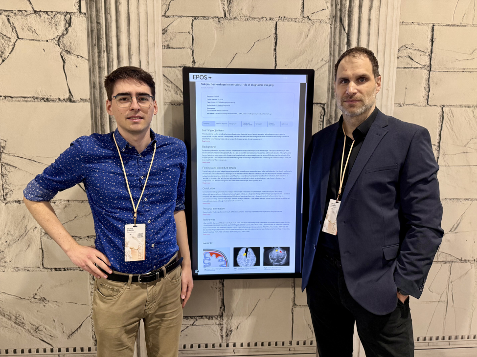 MUDr. Bruno Jurášek představil didaktický poster Subpial haemorrhage in neonates – role of diagnostic imaging. Zaměřil se na málo známou problematiku subpiálního krvácení u novorozenců, popsal rizikové faktory tohoto onemocnění, typické nálezy na zobrazovacích metodách i jeho klinický význam.
