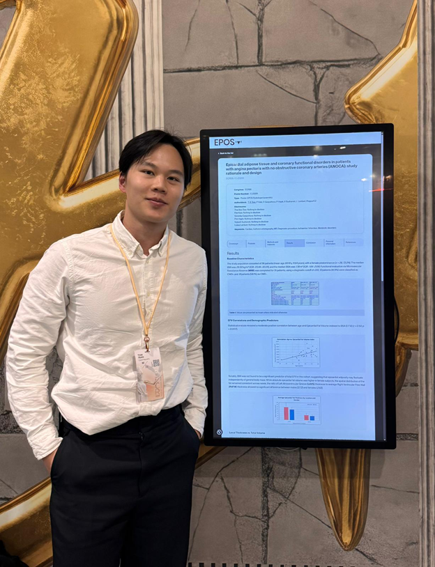 MUDr. Bao Tran prezentoval poster Epicardial adipose tissue and coronary functional disorders in patients with angina pectoris with no obstructive coronary arteries (ANOCA): study rationale and design. Práce se zabývá vztahem mezi množstvím epikardiální tukové tkáně a poruchou koronární mikrocirkulace u pacientů s anginou pectoris bez významného zúžení koronárních tepen. Výsledky naznačují, že vyšší objem epikardiálního tuku může souviset s mikrovaskulární dysfunkcí a přispět k lepšímu pochopení patofyziologických mechanismů tohoto onemocnění.