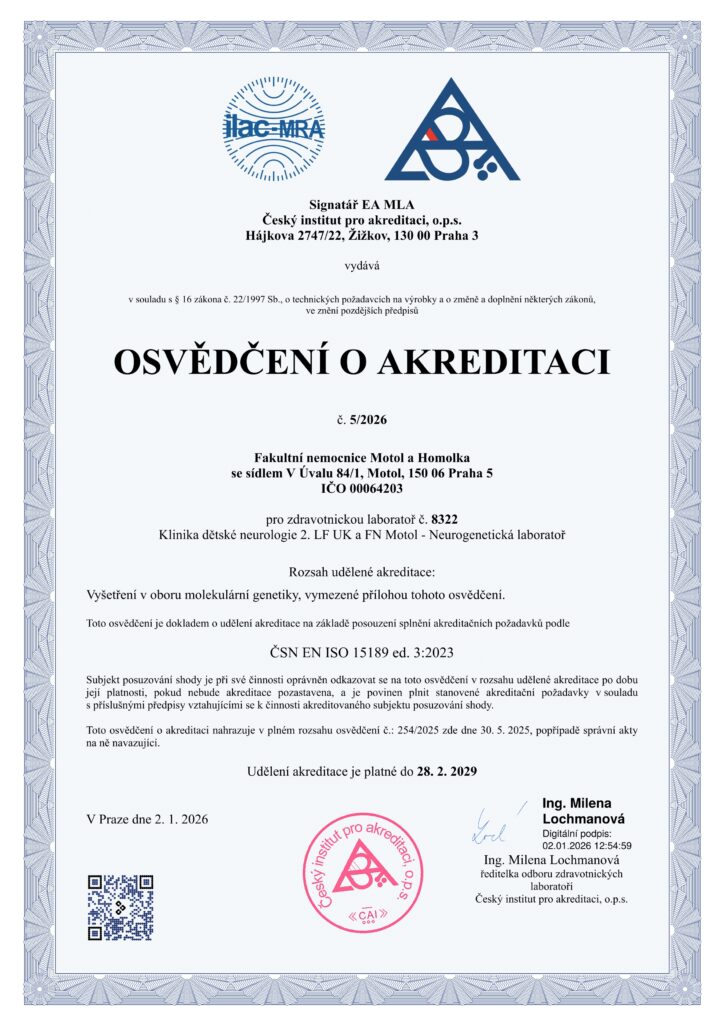 Laboratoř nabízí vyšetření skupiny genů spojovaných s neurovývojovými poruchami včetně poruch autistického spektra a poruch vývoje intelektu. Vyšetření je provedeno pomocí vyhodnocení virtuálního panelu vybraných genů z dat exomového sekvenování (ES). Součástí hodnocení panelu genů je i analýza CNV (copy number variations) zaměřená na detekci velkých delecí nebo duplikací v genech. Vyšetření je dále možné rozšířit po zaslání žádosti na vyhodnocení dat z celého exomu, součástí je také CNV a TR analýza a analýza mitochondriálního genomu (rozšířené vyšetření je prováděno mimo rozsah akreditace).